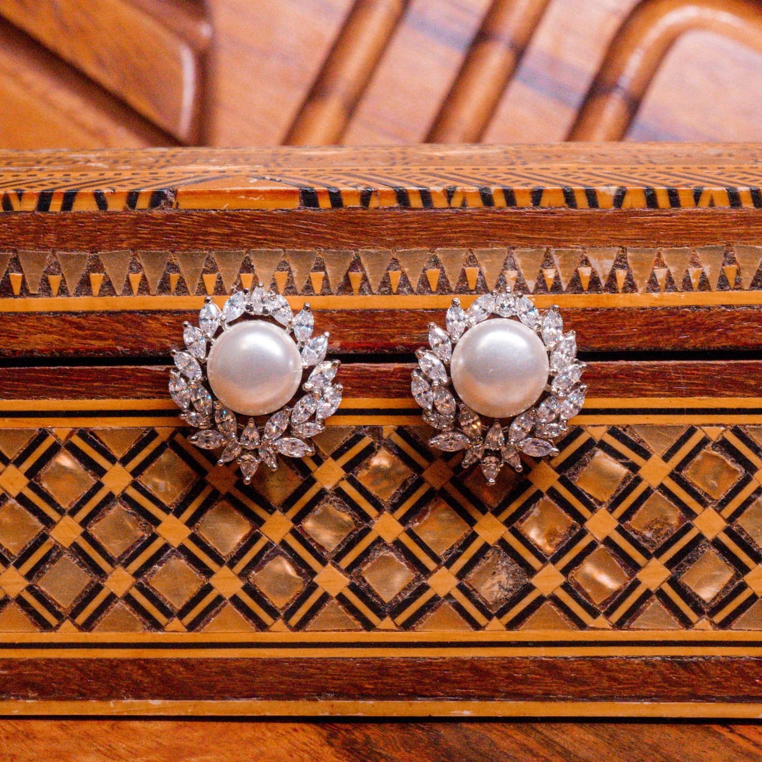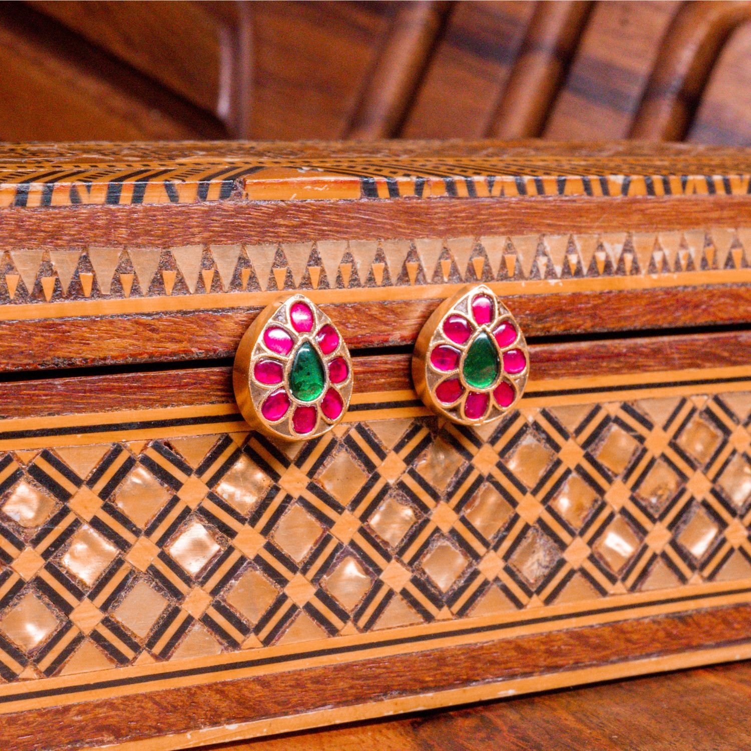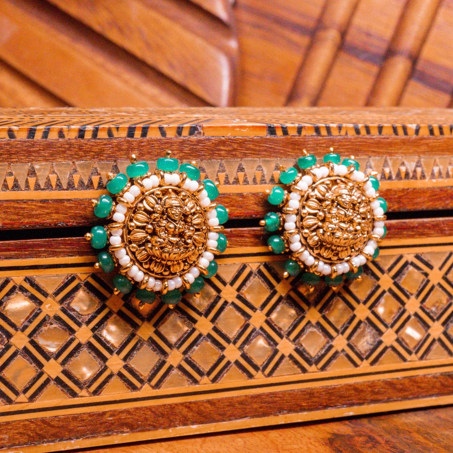 Adorn your ears with the beauty of our Lakshmi Motif Studs. These exquisite earrings feature a central medallion with the revered Goddess Lakshmi, symbolizing prosperity and good fortune. This divine motif is framed by a striking halo of rich green beads and delicate white pearls, creating a beautiful floral pattern. Perfect for adding a touch of traditional elegance and spiritual grace to any ensemble.